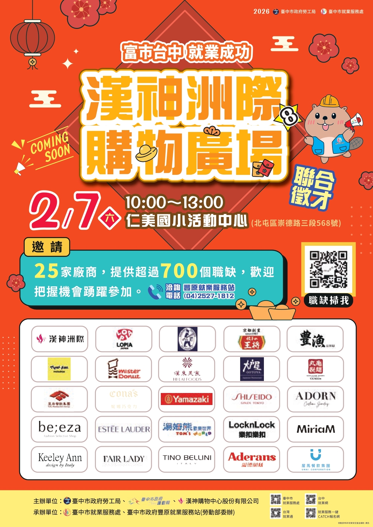 臺中市政府2月7日在仁美國小辦理漢神洲際徵才,邀請25家漢神進駐廠商提供逾700個職缺,歡迎踴躍參加,詳情請至臺中市就業服務處官網查詢。